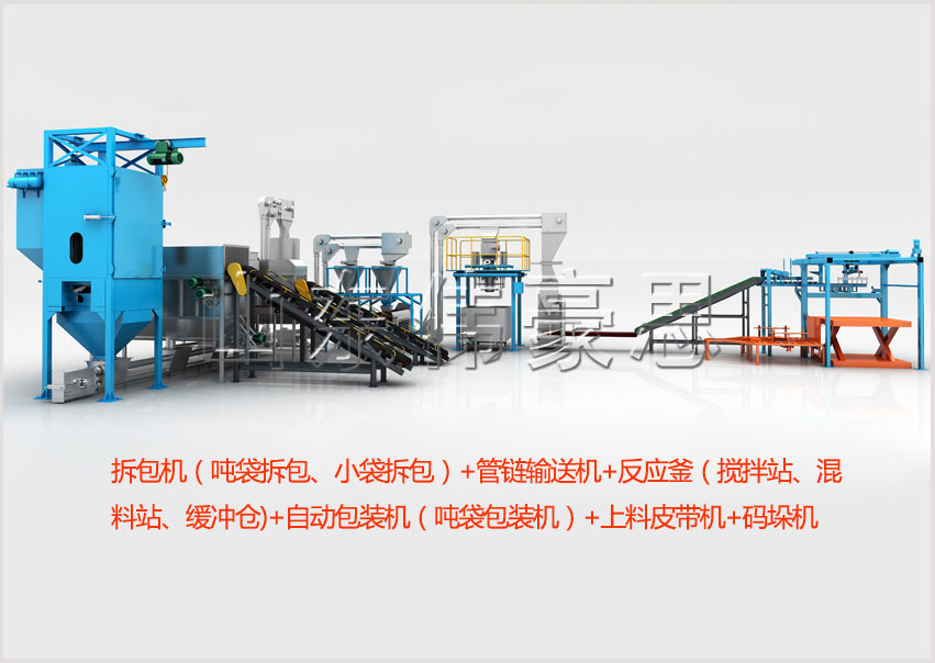 自动拆垛机---自动拆包机(吨包、10-50KG小包)---全密闭管链输送机(多点进料多点出料)--料仓(反应釜、混合机)--自动配料---自动包装(吨包、10-50KG小包)--码垛机械手---定位输送(叉车、AGV小车)